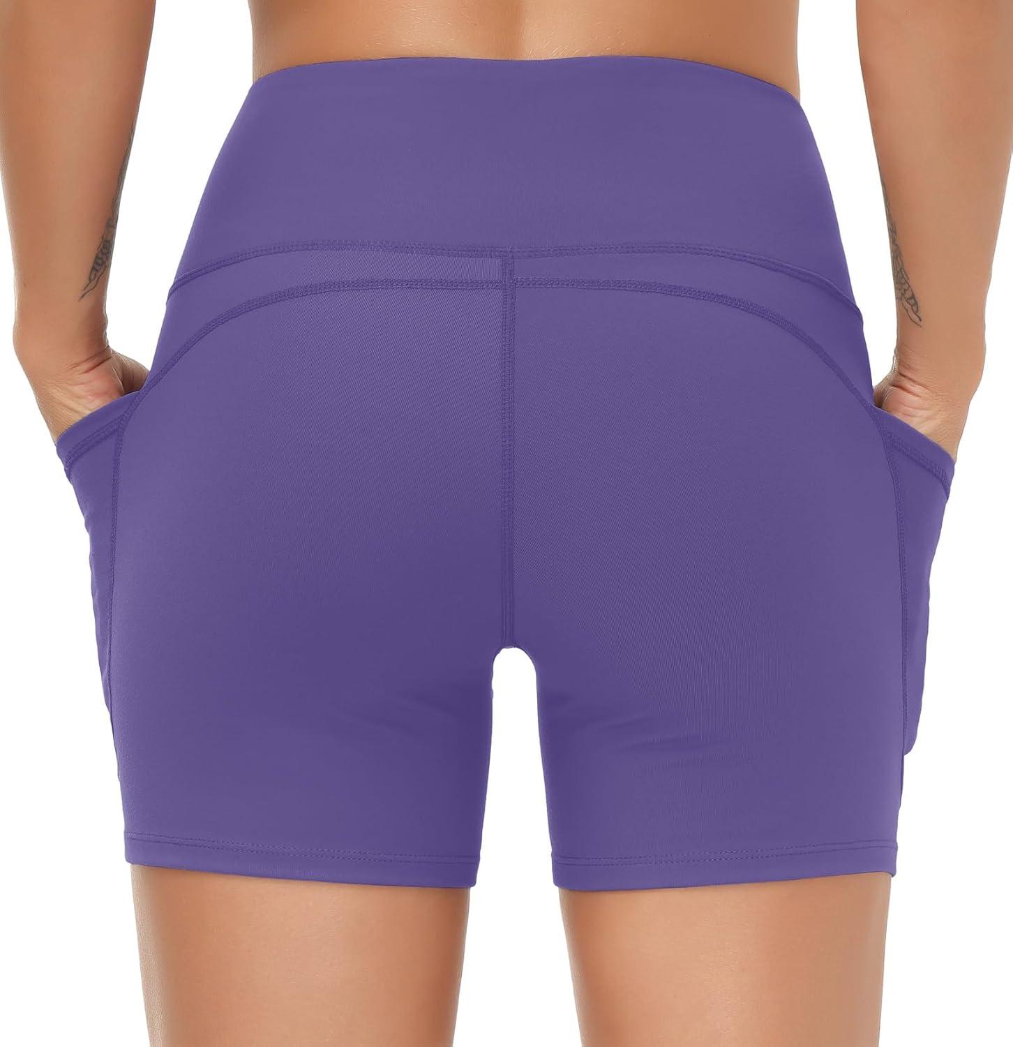 THE GYM PEOPLE High Waist Yoga Shorts for Women's Tummy Control Fitness Athletic Workout Running Shorts with Deep Pockets(Bright Purple)