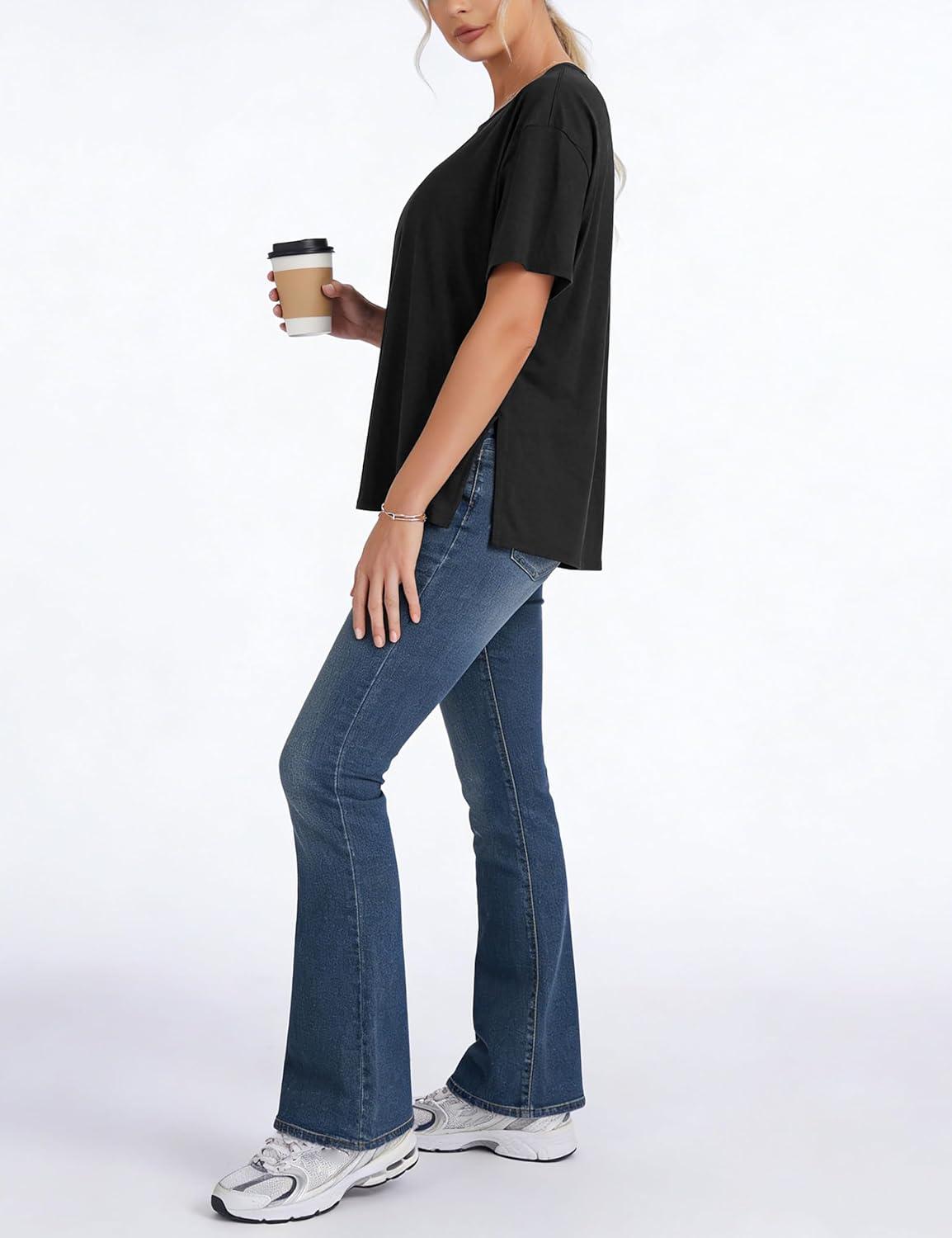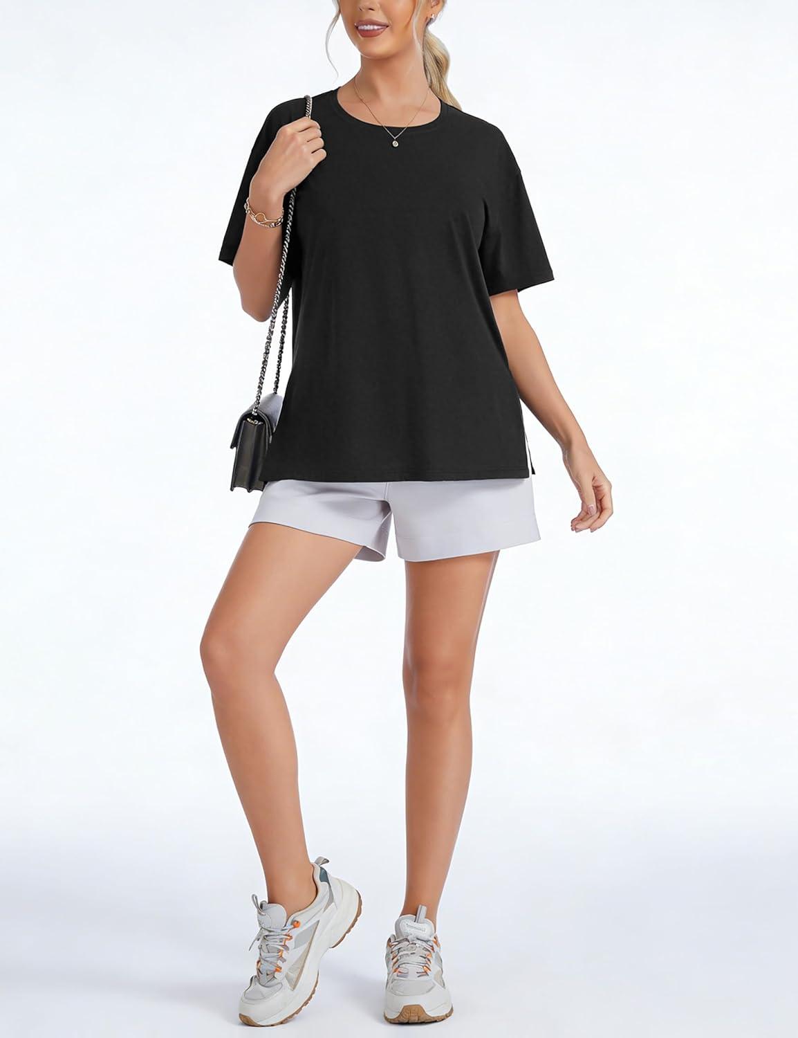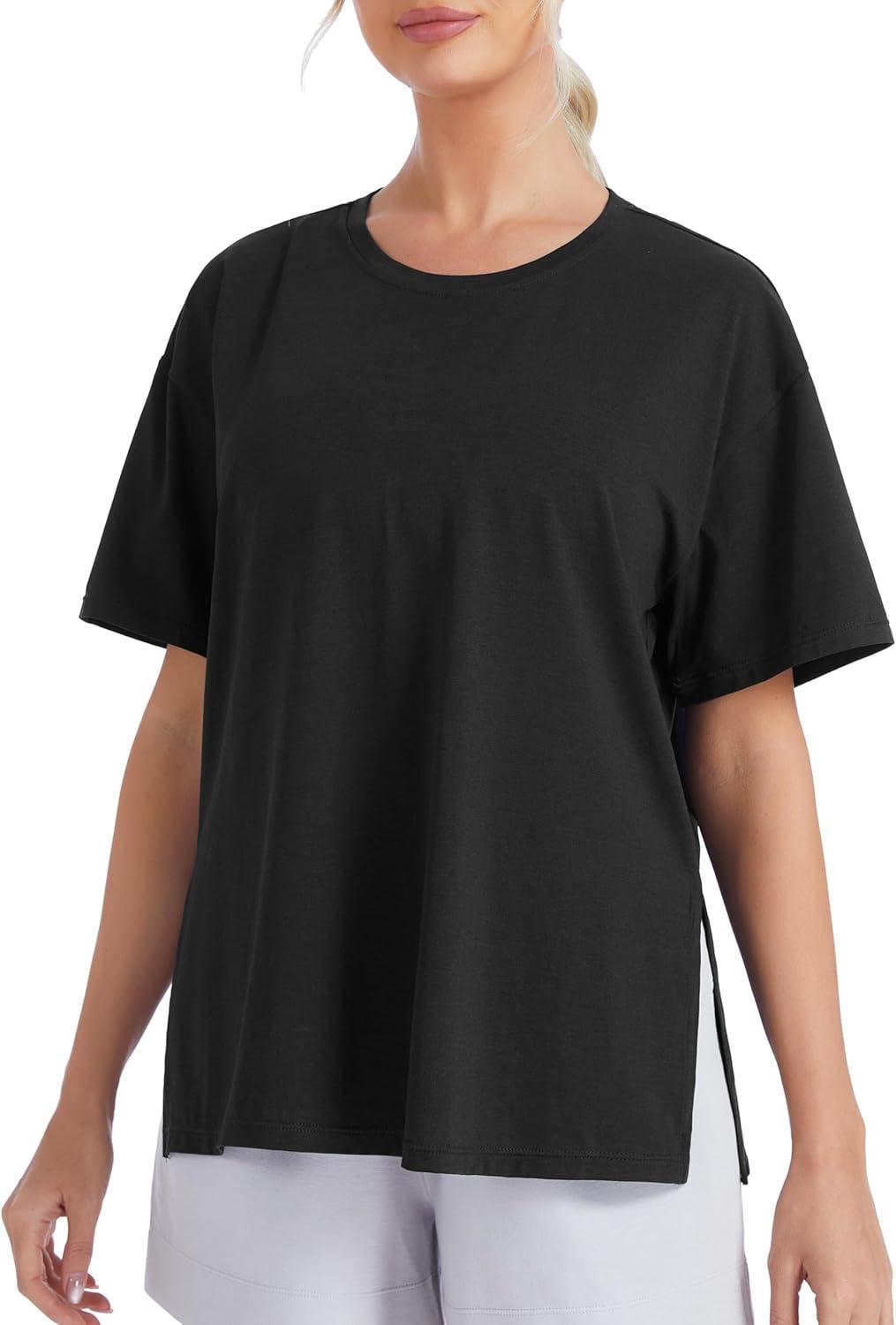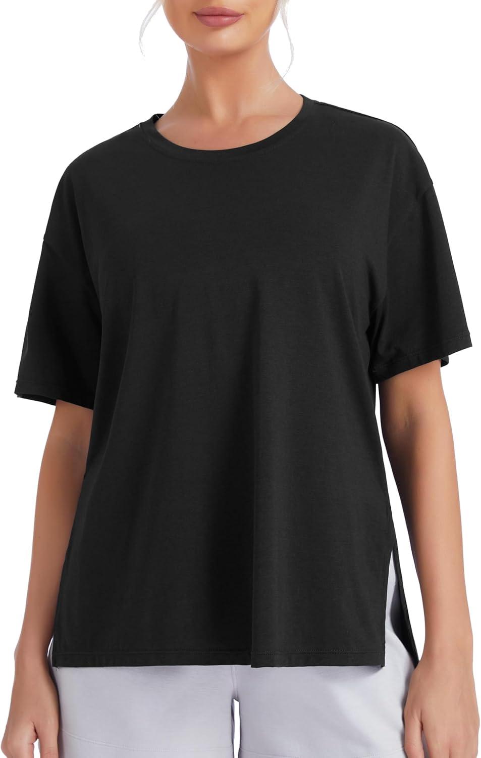 THE GYM PEOPLE Women's Loose Fit Short Sleeve Workout T-Shirts with Side Slit Crewneck Summer Lightweight Casual Top Tees(Black)