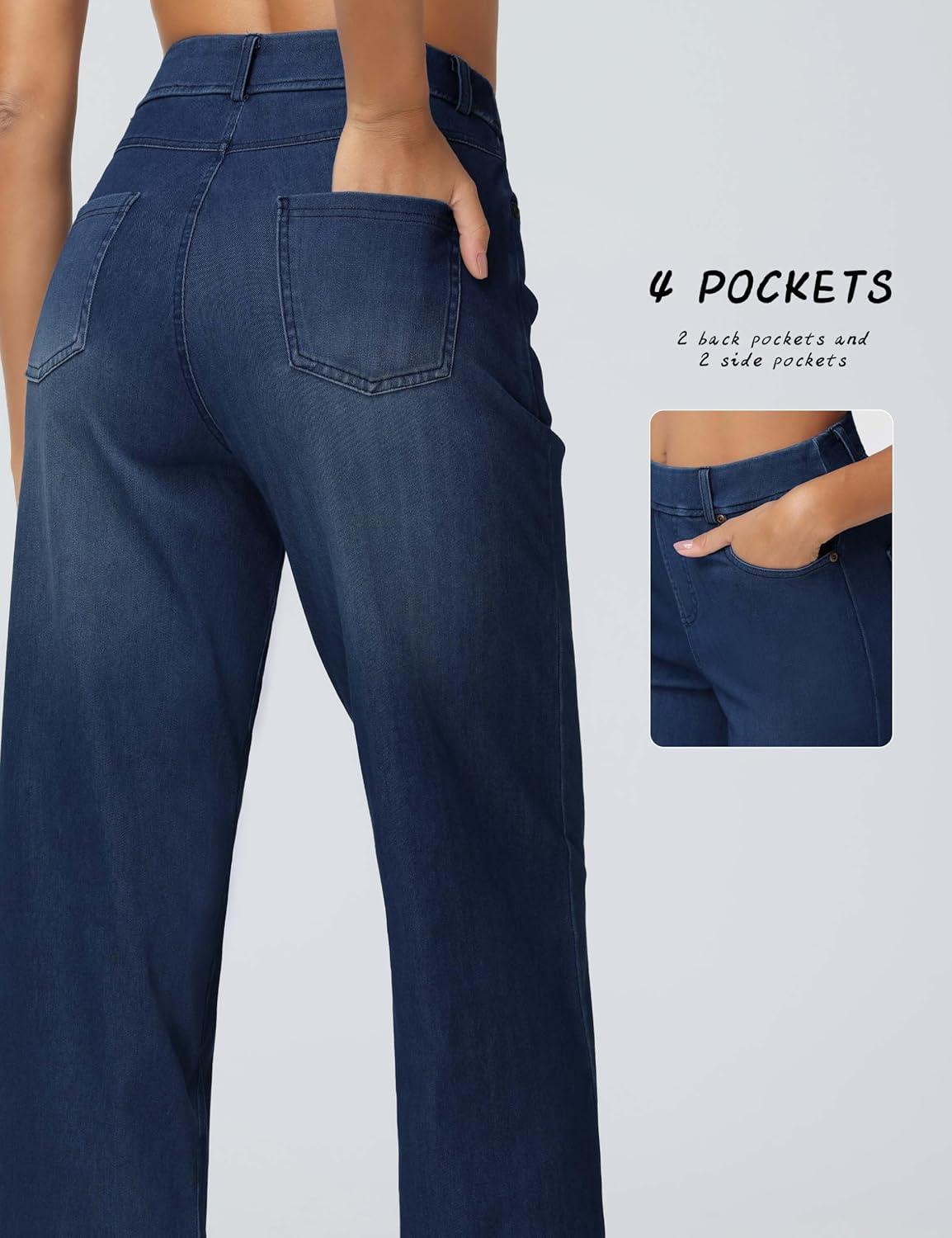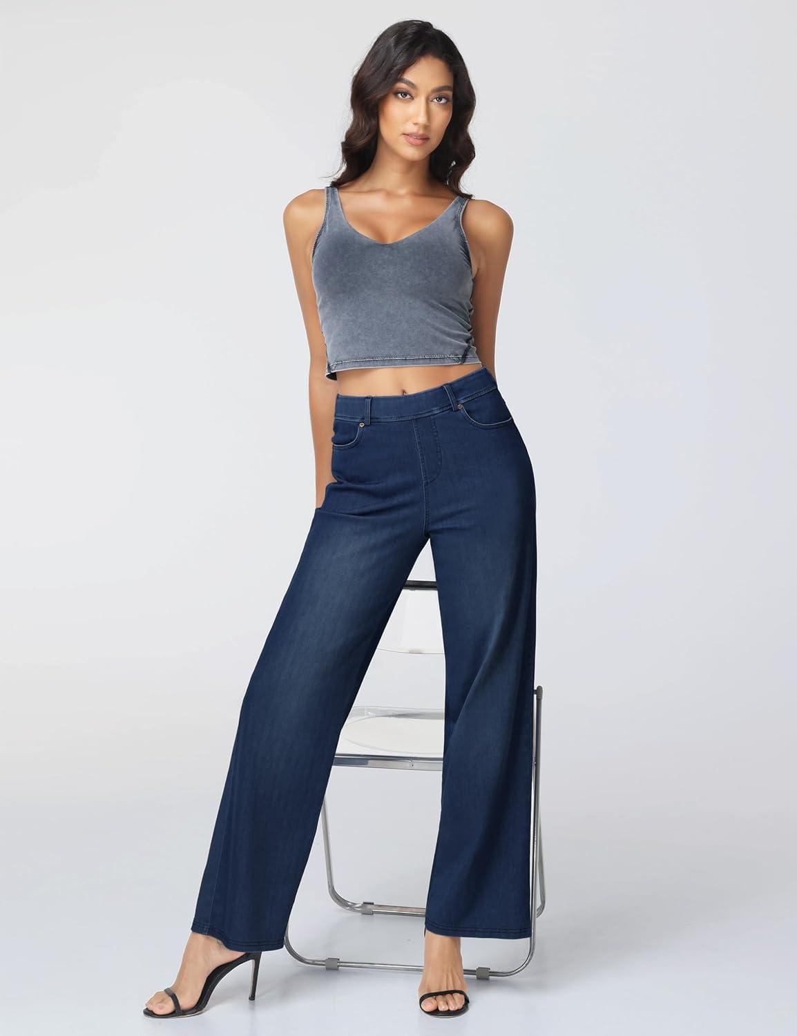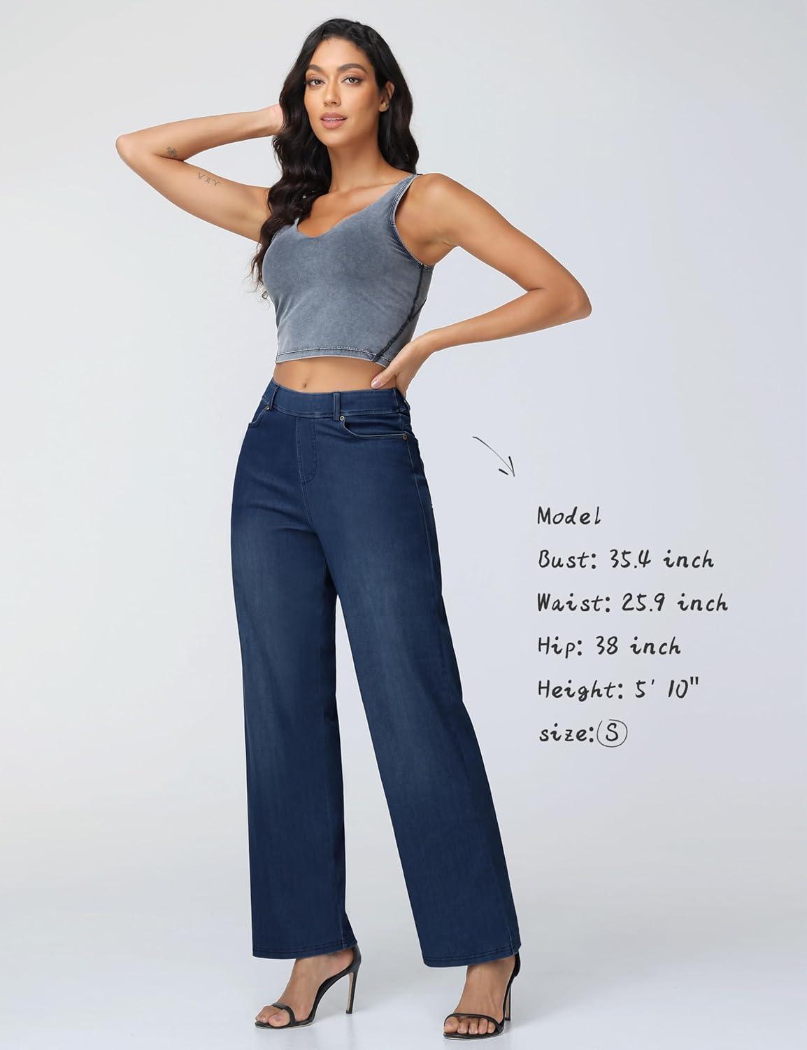 THE GYM PEOPLE Women's Wide Leg Pull on Jeans Stretchy Baggy Trendy Casual Straight Denim Pants with Pockets(Dark Blue)
