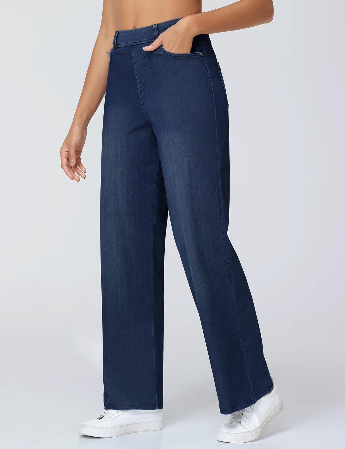 imageTHE GYM PEOPLE Womens Wide Leg Pull on Jeans Stretchy Baggy Trendy Casual Straight Denim Pants with PocketsDark Blue